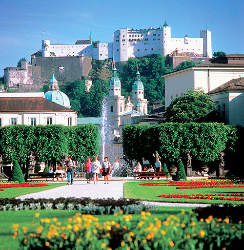 Вид на средневековую Крепость Хоэнзальцбург (нем. Festung Hohensalzburg) из придворных садов Дворца Мирабель (нем. Schloss Mirabell) /  Salzburg, ÖsterreichАвстрия, горы АльпыРотенбург-об-дер-Таубер с фонтаном, Франкония, Бавария